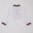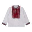 Сорочка для хлопчика класичного крою з довгими рукавами та комірцем стійкою.Оформлена червоно-чорним орнаментом спереду, вздовж комірця та на рукавах.Рукави застібаються на кнопки.Також можна замовити сорочку з короткими рукавами.