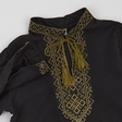 Вишита сорочка для хлопчика класичного крою з довгими рукавами та комірцем стійкою.Оформлена вишивкою спереду, вздовж комірця та на рукавах (вишивка хрестиком зеленою ниткою).Рукави застібаються на кнопки.Також можна замовити сорочку з короткими рукавами.Тканина: чорний льон.