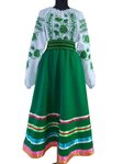 Костюм жіночий в українському стилі.Ціна вказана на 42 і 44 розміри. На наступні розміри ціна змінюється і залежить від наданих замірів (довжина рукава від шиї, обхват грудей, обхват талії, обхват бедер, довжина спідниці)!До складу костюма входять: - спідниця напівкльош зі стрічками зеленого кольору (Тканина: габардин);